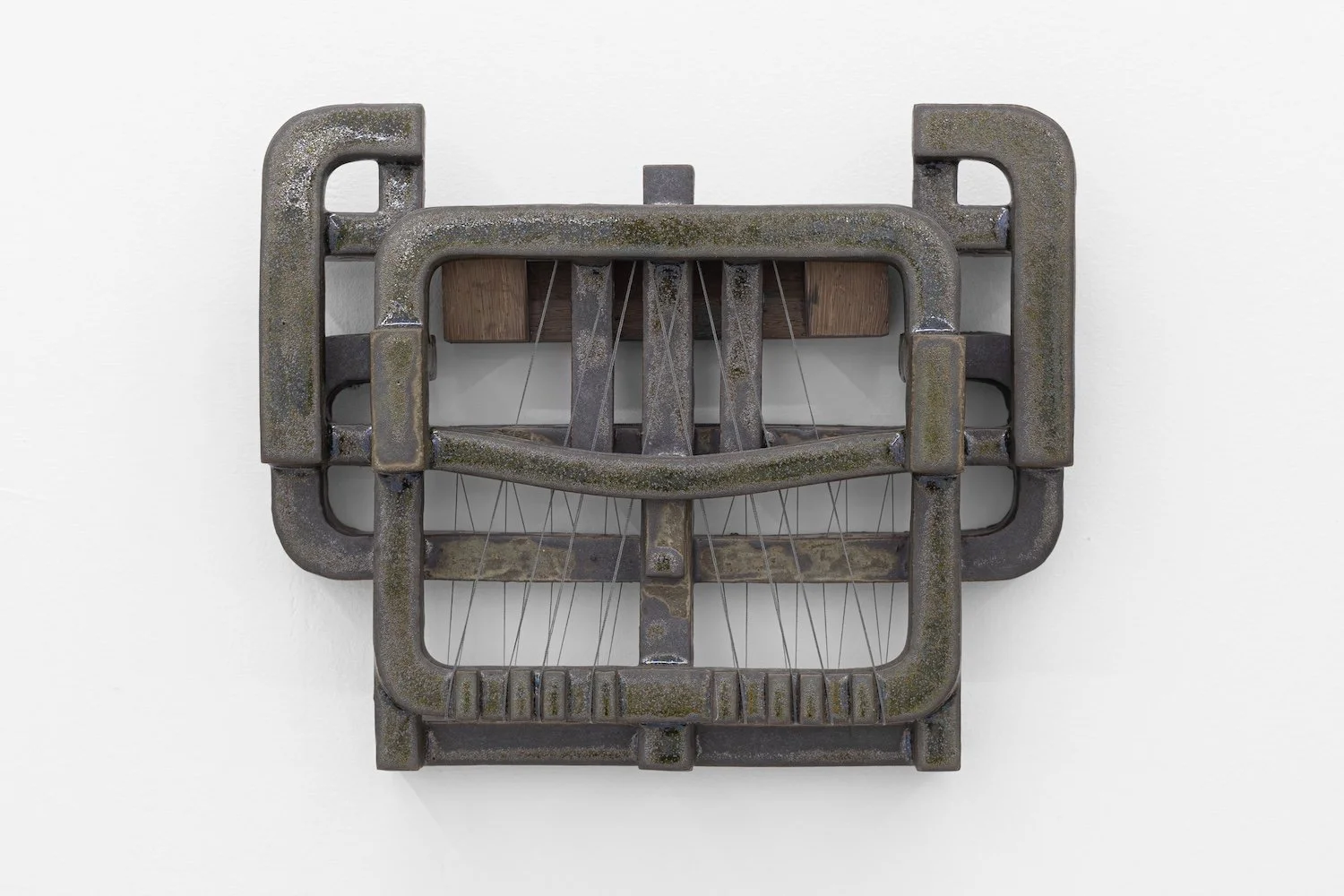 Vibe Overgaard, Industrion Mainframe Section 1a, wood, ceramic, thread, 28.5 x 23.5 x 4.0 cm, 2024
