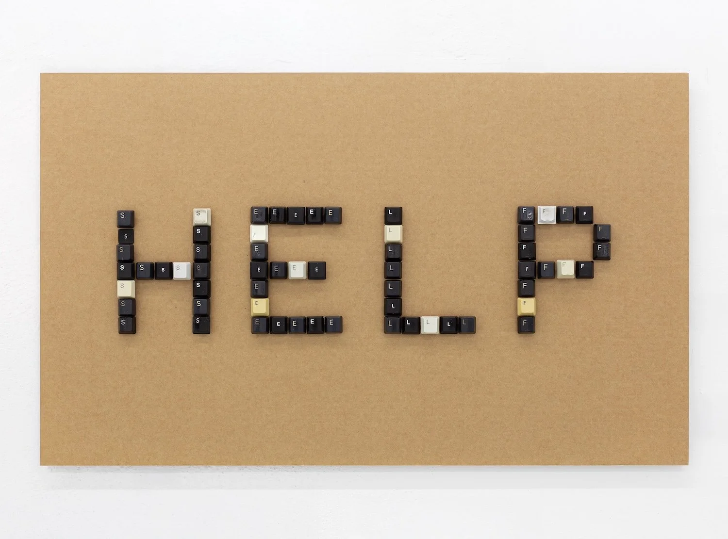 Maryam Jafri, SELF HELP, cardboard on alu-dibond, keyboard keycaps, 66.0 x 40.0 cm, 2025