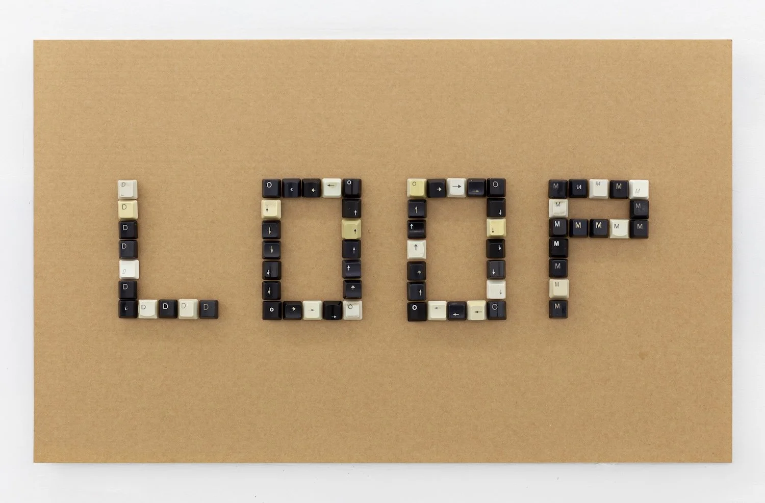 Maryam Jafri, DOOM LOOP, cardboard on alu-dibond, keyboard keycaps, 66.0 x 40.0 cm, 2024