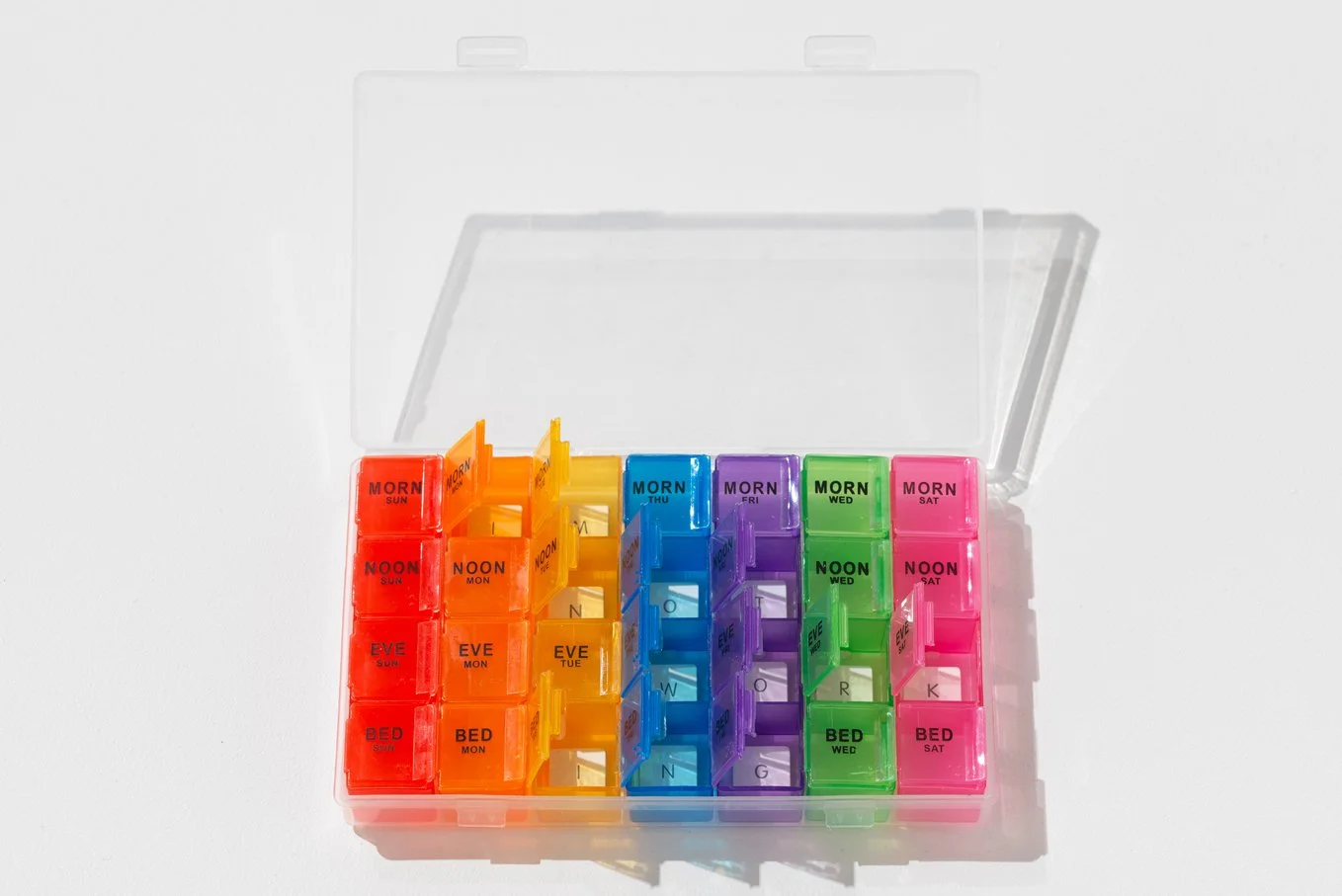 Maryam Jafri, I'm Not Working (No Lithium, No Work), pill organizer, keyboard letters, 5.08 x 22.86 x 12.70 cm, 2023